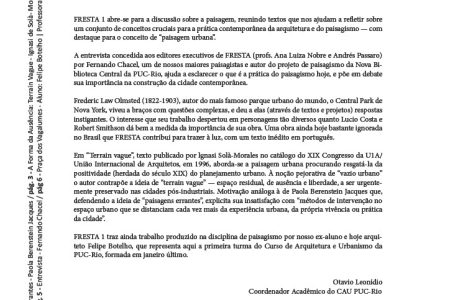 Em sua primeira edição – preparada pelos Professores Ana Luiza Nobre e Andres Passaso e com projeto gráfico desenvolvido pelo Escritório Modelo de Arquitetura e Design da PUC-Rio – Fresta meproduz trecho da aula inaugural do ano de 2006 do CAU, proferida pelo arquiteto Joio Filgueiras Lima, o Lele (pag, 5). A escolha de Lele (que naturalmente dispensa justificacoes) nao se deveu apenas a extraordinina qualidade de sua obra; deveu-se tambem à excepcionalidade de uma pritica, possivelmente única no mundo, que pensa a arquitetura nao apenas como construcão, mas tambem e sobretudo como produçio. Num momento em que tudo ou quase tudo se reduz à imagem efemera e consumivel, a ala de Lele afirmou a força e a atualidade de uma arquitetura francamente modera, porque comprometida com a conatrução dos espaços da vida moderna, sobretudo da cidade.